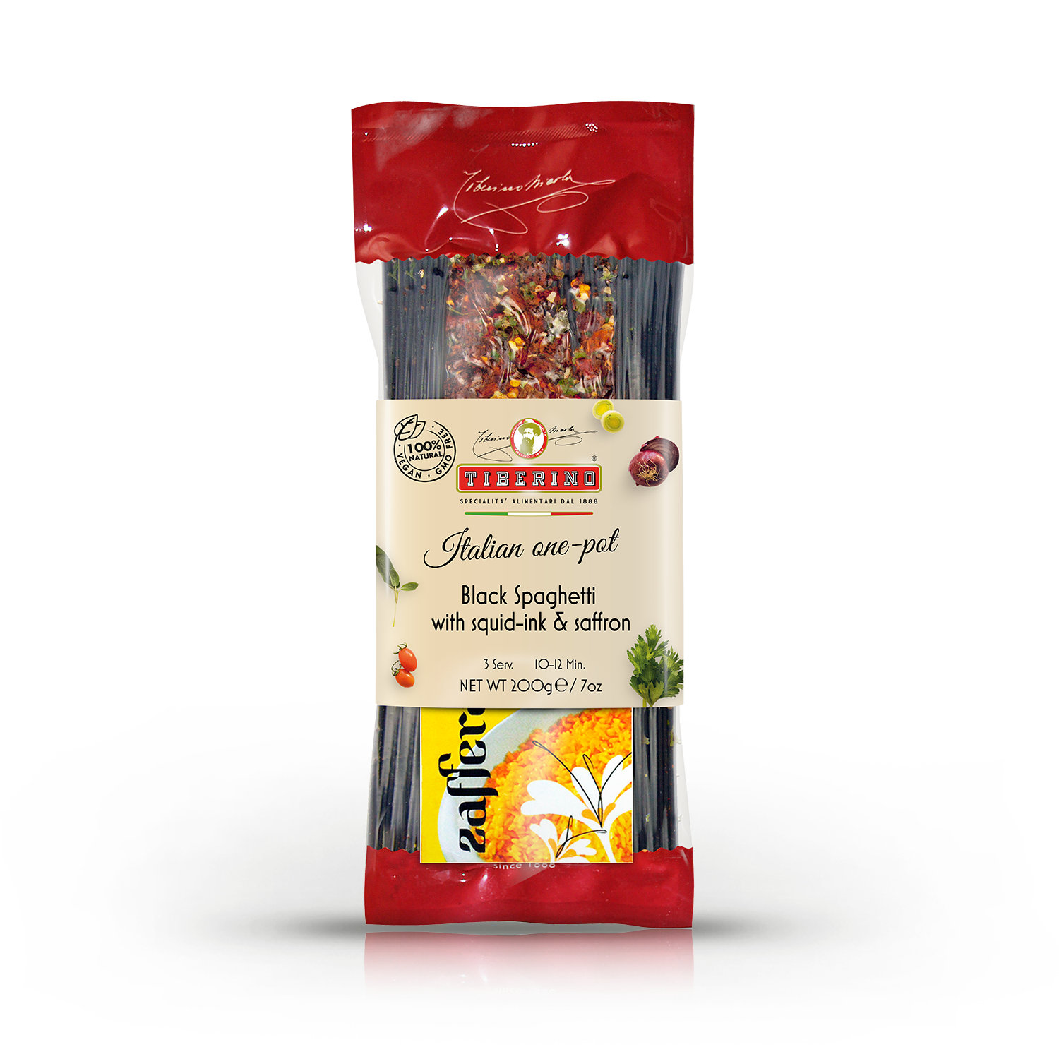 Schwarze Spaghetti mit Tintenfisch & Safran, küchenfertige italienische Pasta - One Pot