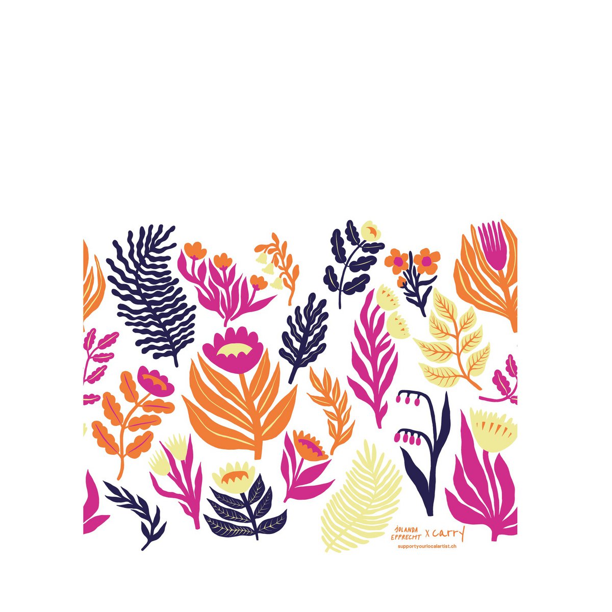 Für die Carry Bottle hat die Illustratorin Jolanda von supportyourlocalartist.ch sich für starke Form- und Farbkontraste entschieden. Ein leuchtendes Pink und ein knalliges Orange stehen einem dunklen Blau und einem Pastellgelb gegenüber, filigrane Blätterformen treffen auf kräftige Blüten. Das Ergebnis ist eine farbenfrohe Trinkflasche die florale Freude in den Alltag bringt.