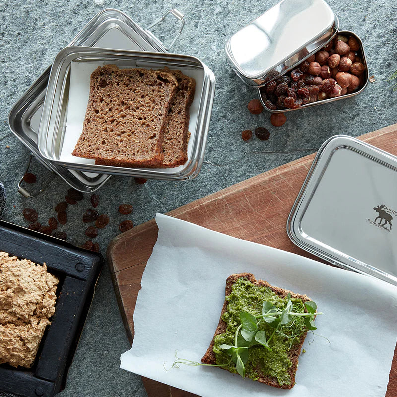 Die PureLunchbox Medium 3-in-1 ist eine praktische Lunchbox, mit zwei separaten Fächern und einer mitgelieferten Snackbox. Die Lunchbox ist aus lebensmittelechtem Edelstahl gefertigt.