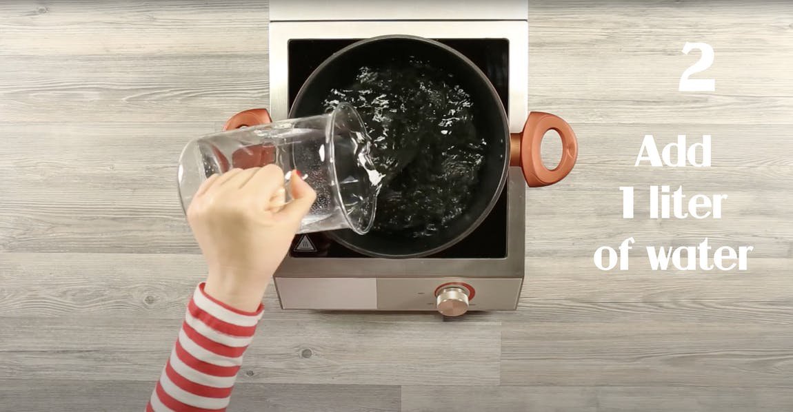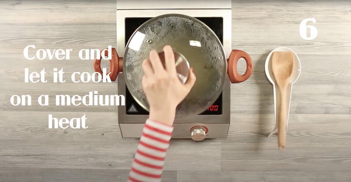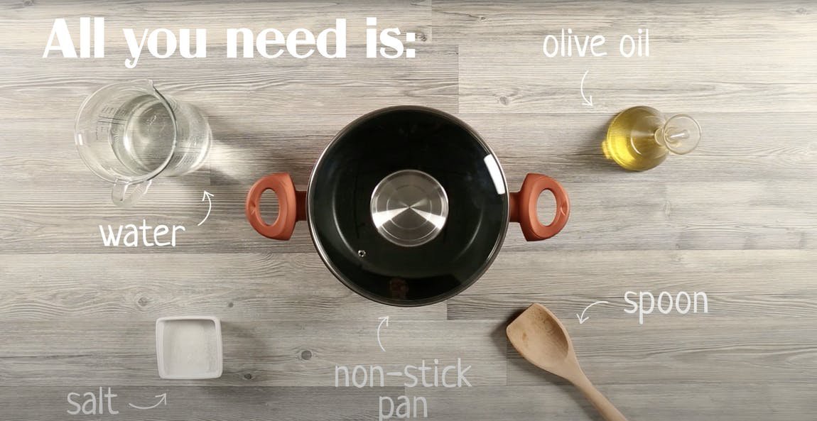 ZUBEREITUNG: Bringen Sie 1 Liter Wasser und 4 EL Öl in einer großen beschichteten Pfanne zum Kochen.
