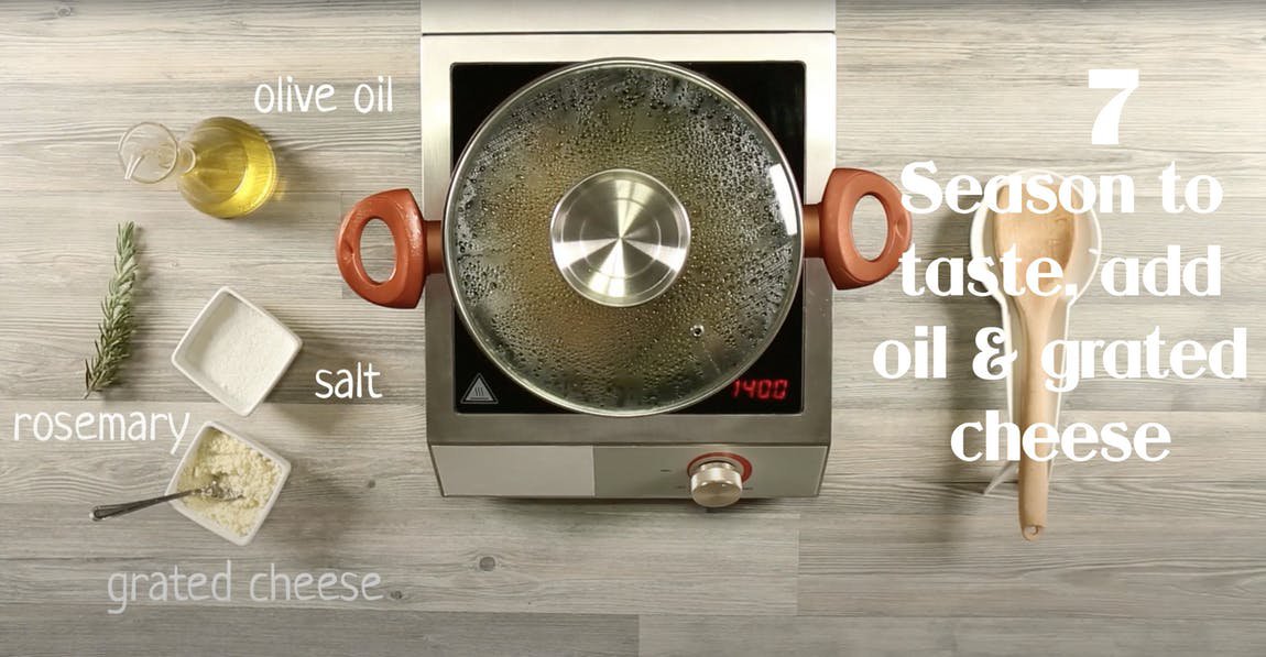 Fügen Sie den Inhalt der Packung hinzu, rühren Sie um, decken Sie ihn ab und kochen Sie ihn bei mittlerer Hitze mindestens 20 Minuten lang, bis der gewünschte Gargrad erreicht ist. Mit Salz oder Pfeffer abschmecken, mit Olivenöl würzen.