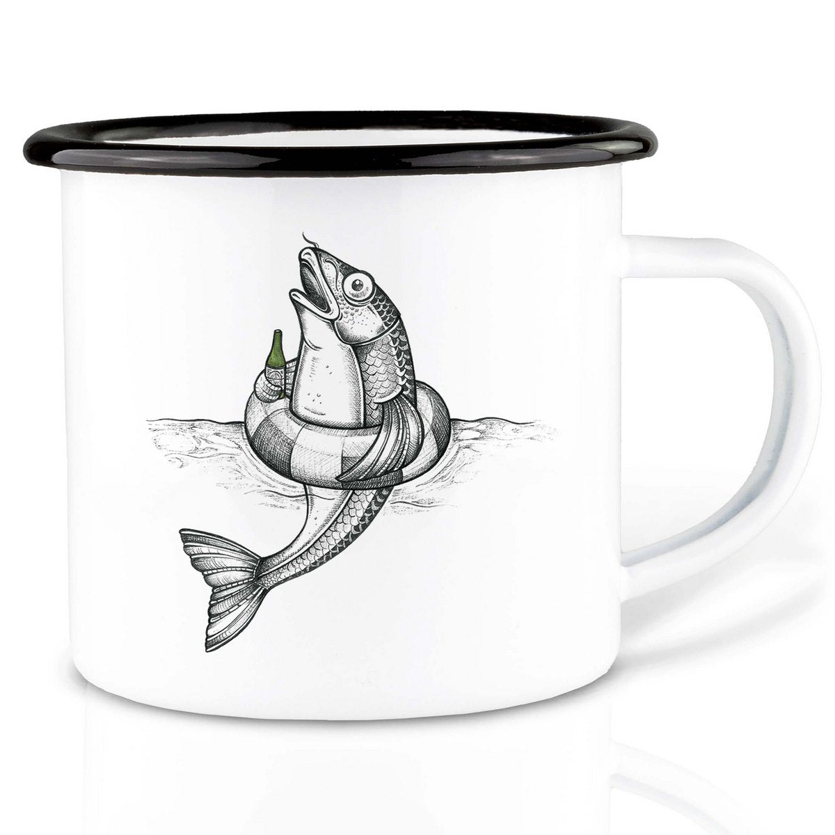 Emailletasse mit Bernd dem Fisch – dein neuer Hingucker am Küchentisch Produktinformationen:• Hochwertige weiße Metalltasse mit schwarzem Rand• 300 ml oder 500 ml Fassungsvermögen• Leicht, robust & wetterfest – ideal auch als Campingtasse für unterwegs• Für dich von Hand bedruckt in unserer Manufaktur in Deutschland• Plastikfreie VerpackungUnsere lustige Fisch-Tasse ist das ideale Geschenk für deine beste Freundin, deine Mama, deinen Kollegen – oder einfach für dich selbst. Ob fürs Büro, für zu Hause oder unterwegs beim Campen und Wandern: Die einzigartigen Designs unserer Künstlerin Hanna Ligeti machen diesen Emaillebecher zu deiner neuen Lieblingstasse.Pflegehinweis: Wir empfehlen die gute alte Handspülung.