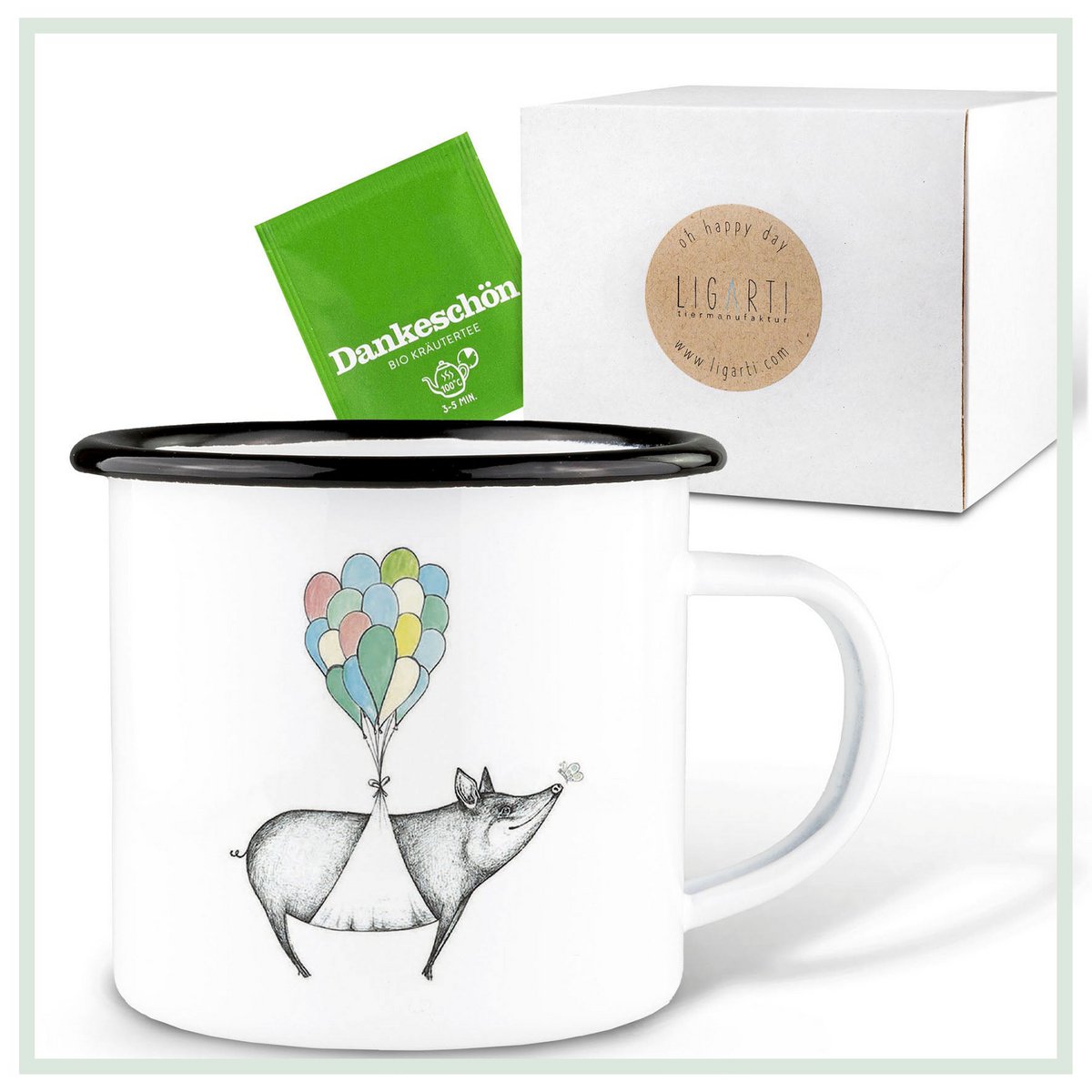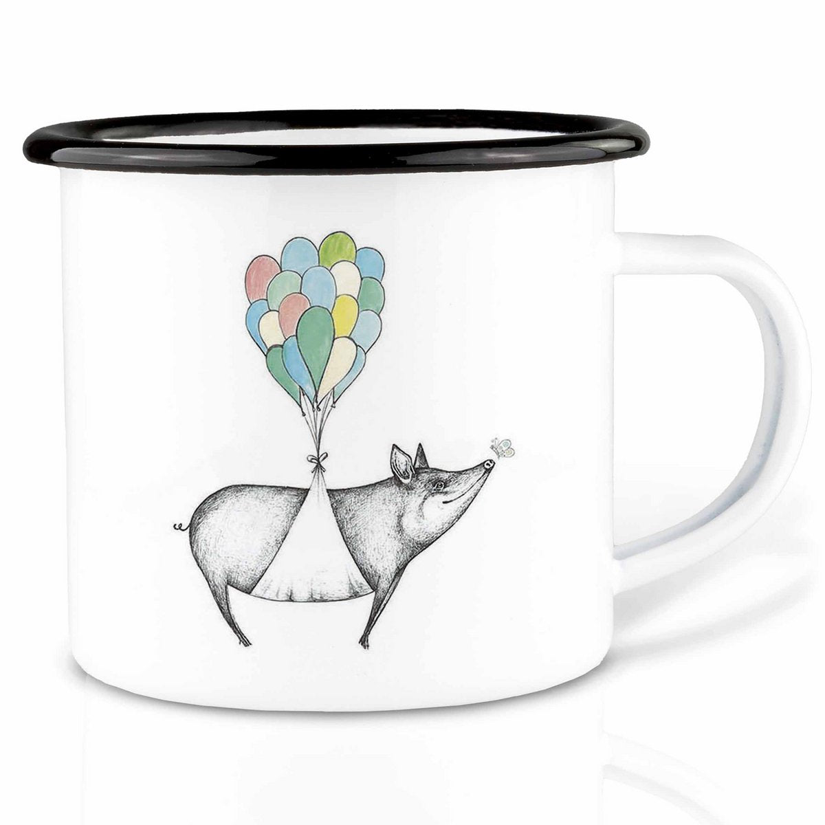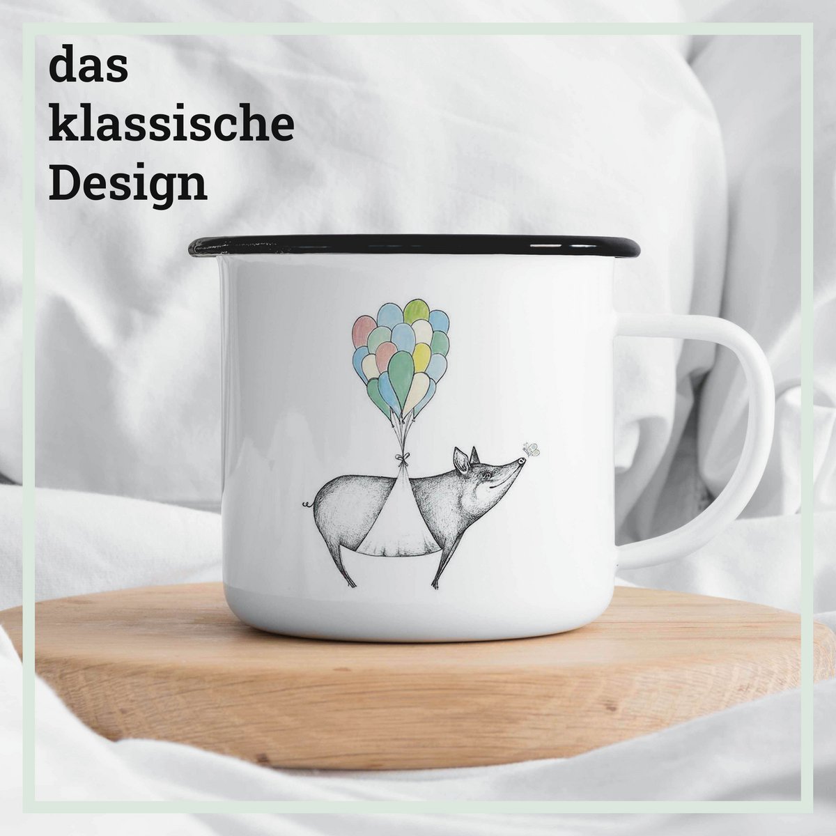 Emailletasse mit Glücksschwein – dein neuer Hingucker am Küchentisch Produktinformationen:• Hochwertige weiße Metalltasse mit schwarzem Rand• 300 ml oder 500 ml Fassungsvermögen• Leicht, robust & wetterfest – ideal auch als Campingtasse für unterwegs• Für dich von Hand bedruckt in unserer Manufaktur in Deutschland• Plastikfreie VerpackungUnsere süße Schwein-Tasse ist das ideale Geschenk für deine beste Freundin, deine Mama, deinen Kollegen – oder einfach für dich selbst. Ob fürs Büro, für zu Hause oder unterwegs beim Campen und Wandern: Die einzigartigen Designs unserer Künstlerin Hanna Ligeti machen diesen Emaillebecher zu deiner neuen Lieblingstasse. Hinweis: Emailletassen sind produktionsbedingt Unikate mit kleinen Unregelmäßigkeiten. Ungleichmäßige Emaillierung oder kleine schwarze Pünktchen sind daher keine Mängel, sondern können bei diesem Produkt dazugehören. Pflegehinweis: Wir empfehlen die gute alte Handspülung.