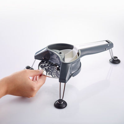 • 3 Schneidscheiben aus Edelstahl • kompakt zusammenlegbar -> wenig Stauraum • 3 Gummifüße geben sicheren Halt auf der Arbeitsfläche|