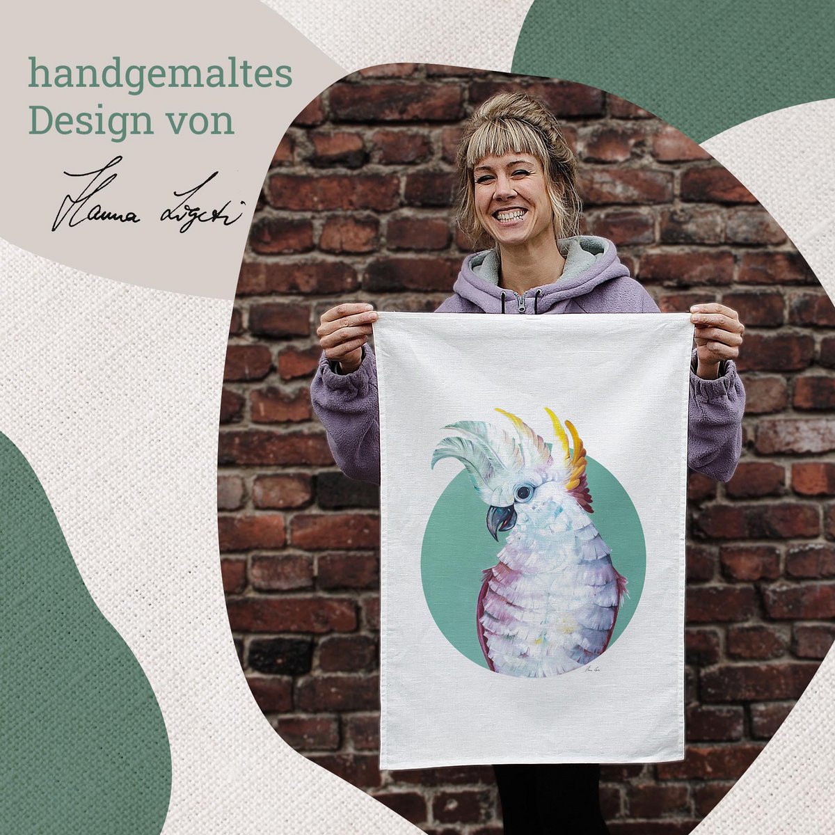 Art Up your Küchenzeile: Geschirrtuch "Kakadu"Produktinformationen:• strapazierfähiges Küchenhandtuch aus Halbleinen (55 % Leinen / 45 % Baumwolle)• in der EU produziert und lokal in Wuppertal für dich bedruckt• Größe: 70 x 50 cm• Der einseitige Druck ist hochwertig und farbintensiv• bei bis zu 60 Grad waschbar• zertifiziert mit dem ÖKO-TEX® Standard 100• Green Energy ProduktionAlles in trockenen Tüchern: Unsere schönen Geschirrtücher sind nicht nur robust, sondern auch noch nachhaltig. Der Druck ist hochwertig und hält Wäschen bei bis zu 60 Grad stand. Und das handgemalte Motiv unserer Künstlerin Hanna Ligeti sorgt dafür, dass dein neues Küchenhandtuch selbst beim Abhängen und Trocknen noch eine gute Figur macht. Sauber!
