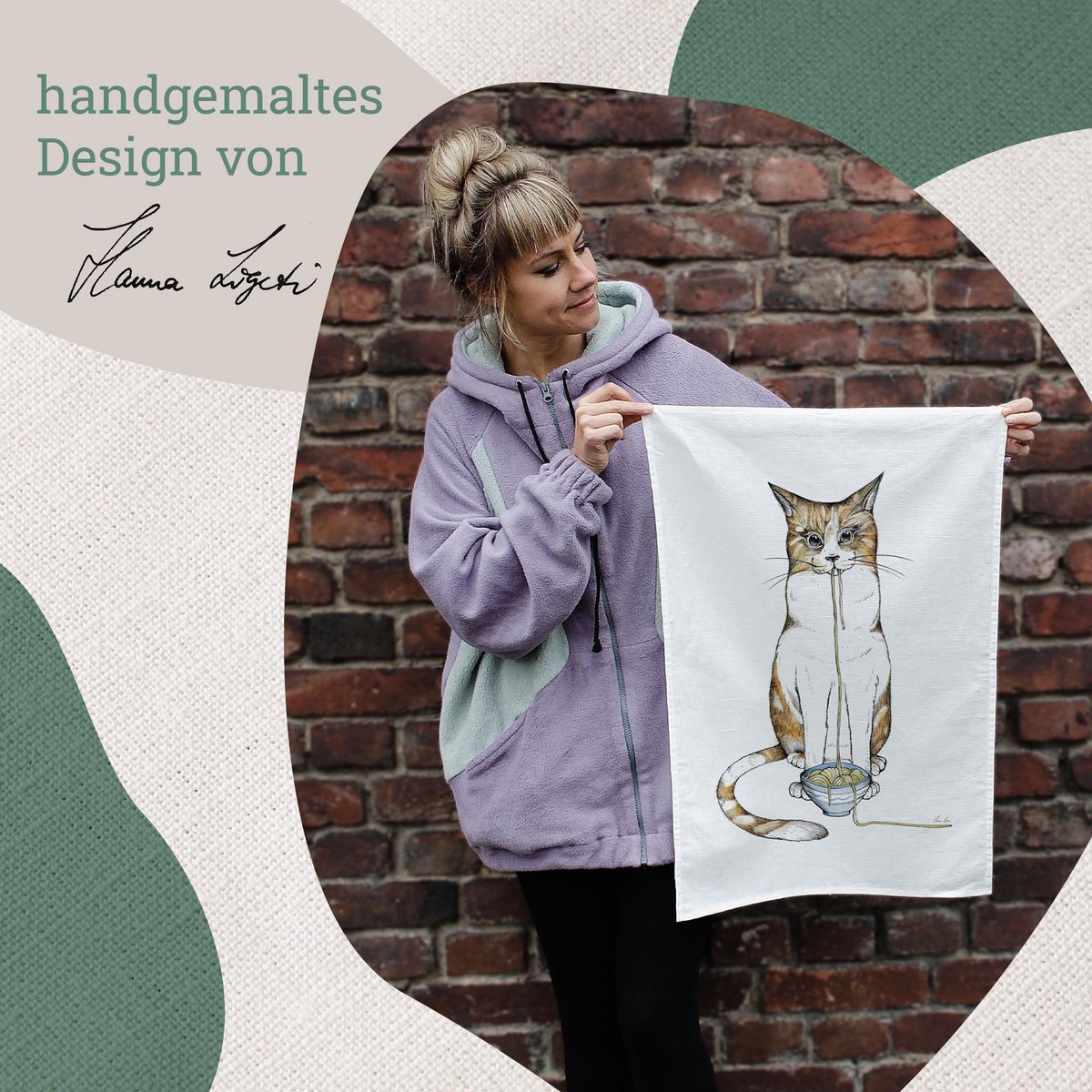 Art Up your Küchenzeile: Geschirrtuch "Ramenkatze"Produktinformationen:• strapazierfähiges Küchenhandtuch aus Halbleinen (55 % Leinen / 45 % Baumwolle)• in der EU produziert und lokal in Wuppertal für dich bedruckt• Größe: 70 x 50 cm• Der einseitige Druck ist hochwertig und farbintensiv• bei bis zu 60 Grad waschbar• zertifiziert mit dem ÖKO-TEX® Standard 100• Green Energy ProduktionAlles in trockenen Tüchern: Unsere schönen Geschirrtücher sind nicht nur robust, sondern auch noch nachhaltig. Der Druck ist hochwertig und hält Wäschen bei bis zu 60 Grad stand. Und das handgemalte Motiv unserer Künstlerin Hanna Ligeti sorgt dafür, dass dein neues Küchenhandtuch selbst beim Abhängen und Trocknen noch eine gute Figur macht. Sauber!