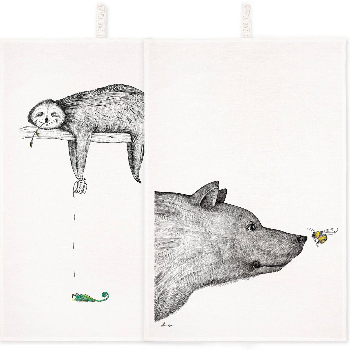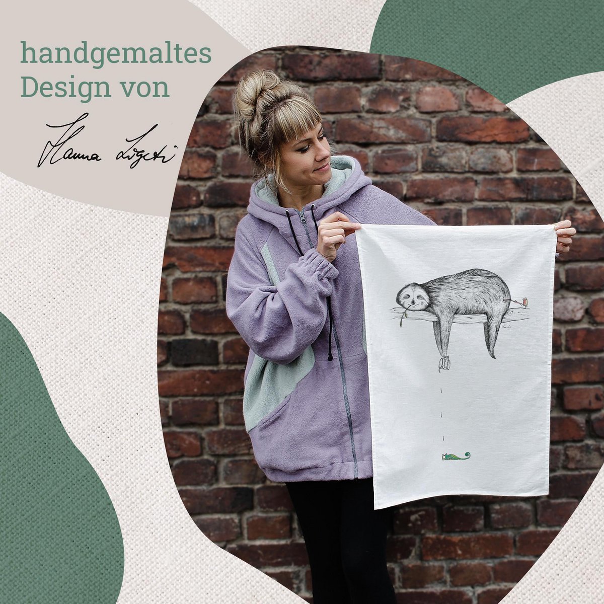 Art Up your Küchenzeile: Geschirrtuch-Set "All Stars"Produktinformationen:• 2er-Set bestehend aus den Motiven "Die Begegnung" und "Faultier"• strapazierfähige Küchenhandtücher aus Halbleinen (55 % Leinen / 45 % Baumwolle)• in der EU produziert und lokal in Wuppertal für dich bedruckt• Größe: 70 x 50 cm• Der einseitige Druck ist hochwertig und farbintensiv• bei bis zu 60 Grad waschbar• zertifiziert mit dem ÖKO-TEX® Standard 100• Green Energy ProduktionAlles in trockenen Tüchern: Unsere schönen Geschirrtücher sind nicht nur robust, sondern auch noch nachhaltig. Der Druck ist hochwertig und hält Wäschen bei bis zu 60 Grad stand. Und das handgemalte Motiv unserer Künstlerin Hanna Ligeti sorgt dafür, dass dein neues Küchenhandtuch selbst beim Abhängen und Trocknen noch eine gute Figur macht. Sauber!