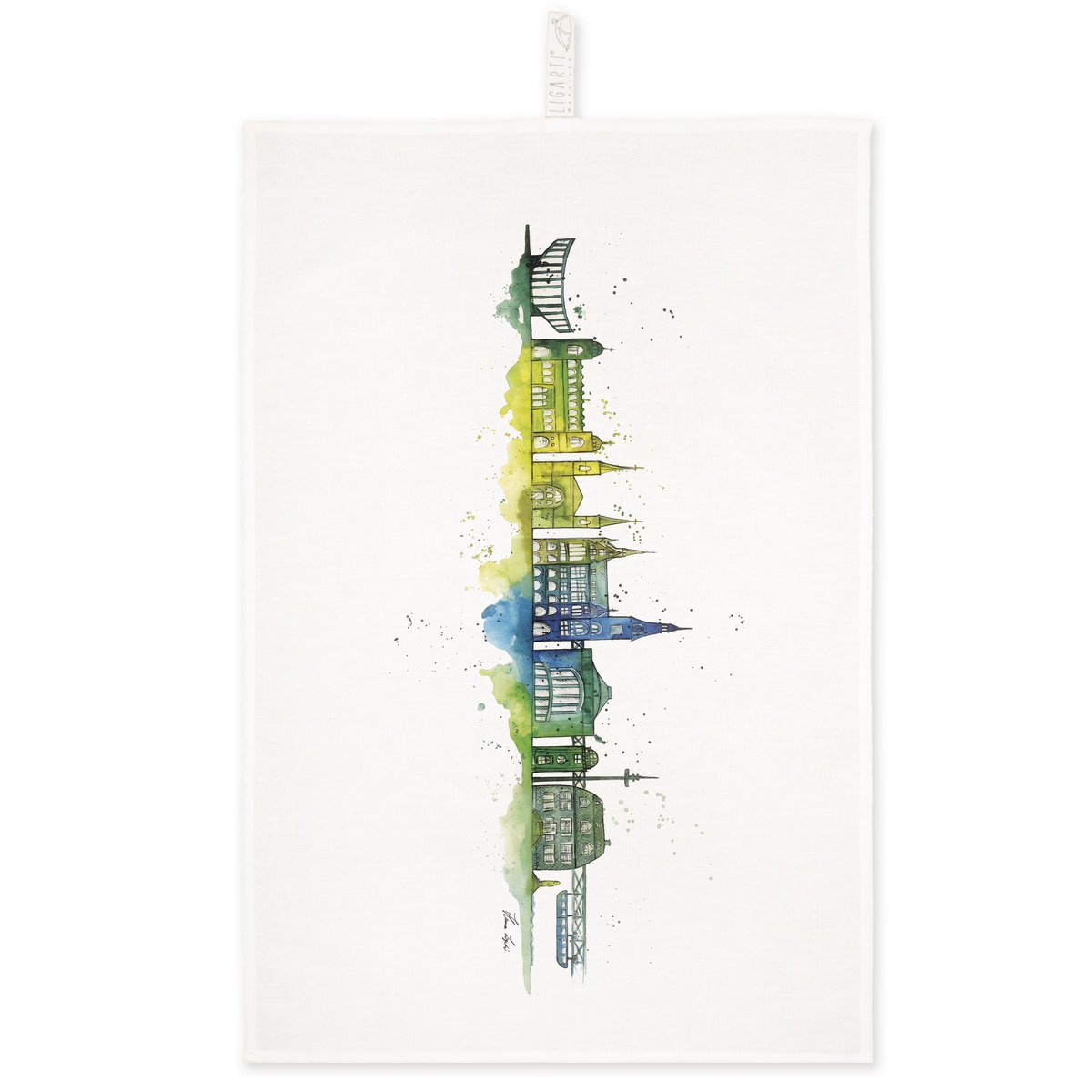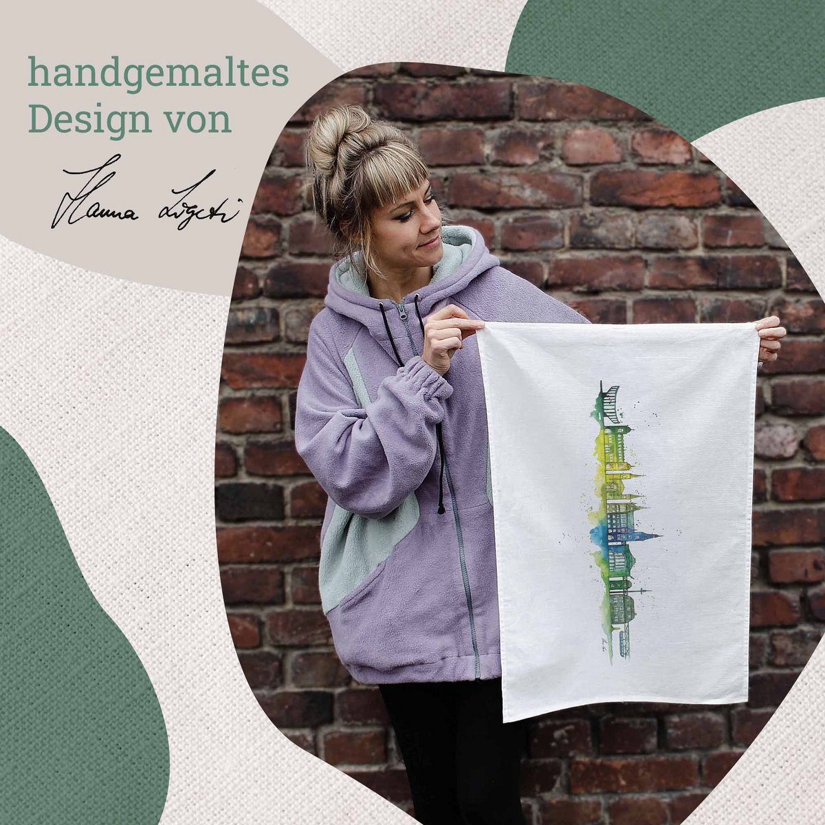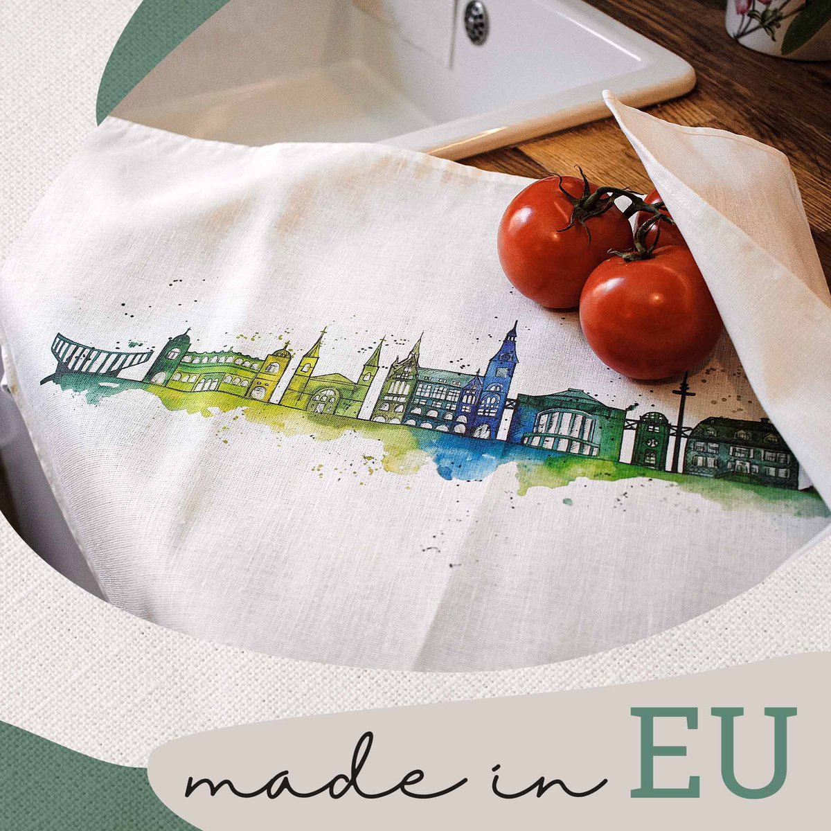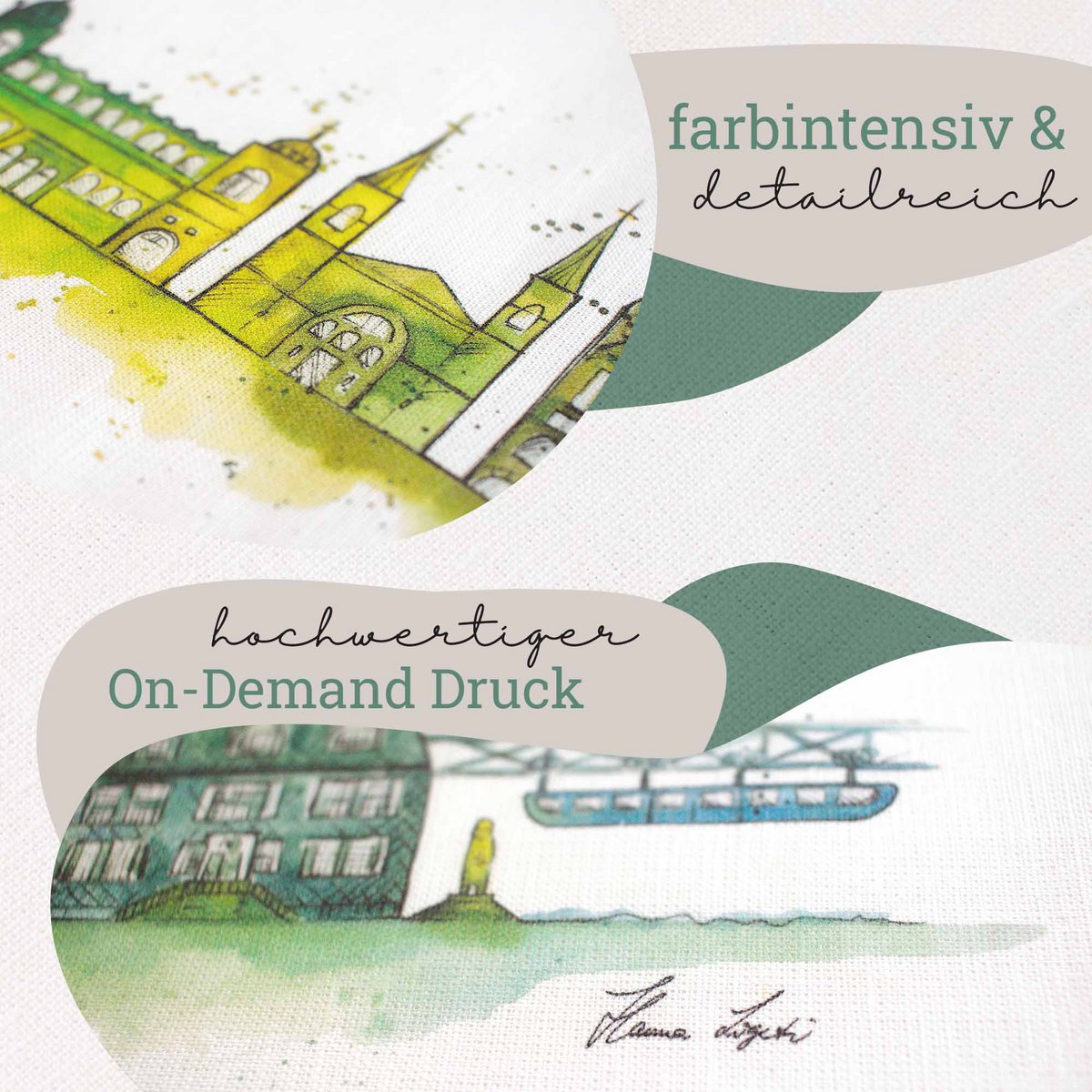 Art Up your Küchenzeile: Geschirrtuch "Wuppertal"Produktinformationen:• strapazierfähiges Küchenhandtuch aus Halbleinen (55 % Leinen / 45 % Baumwolle)• in der EU produziert und lokal in Wuppertal für dich bedruckt• Größe: 70 x 50 cm• Der einseitige Druck ist hochwertig und farbintensiv• bei bis zu 60 Grad waschbar• zertifiziert mit dem ÖKO-TEX® Standard 100• Green Energy ProduktionAlles in trockenen Tüchern: Unsere schönen Geschirrtücher sind nicht nur robust, sondern auch noch nachhaltig. Der Druck ist hochwertig und hält Wäschen bei bis zu 60 Grad stand. Und das handgemalte Motiv unserer Künstlerin Hanna Ligeti sorgt dafür, dass dein neues Küchenhandtuch selbst beim Abhängen und Trocknen noch eine gute Figur macht. Sauber!