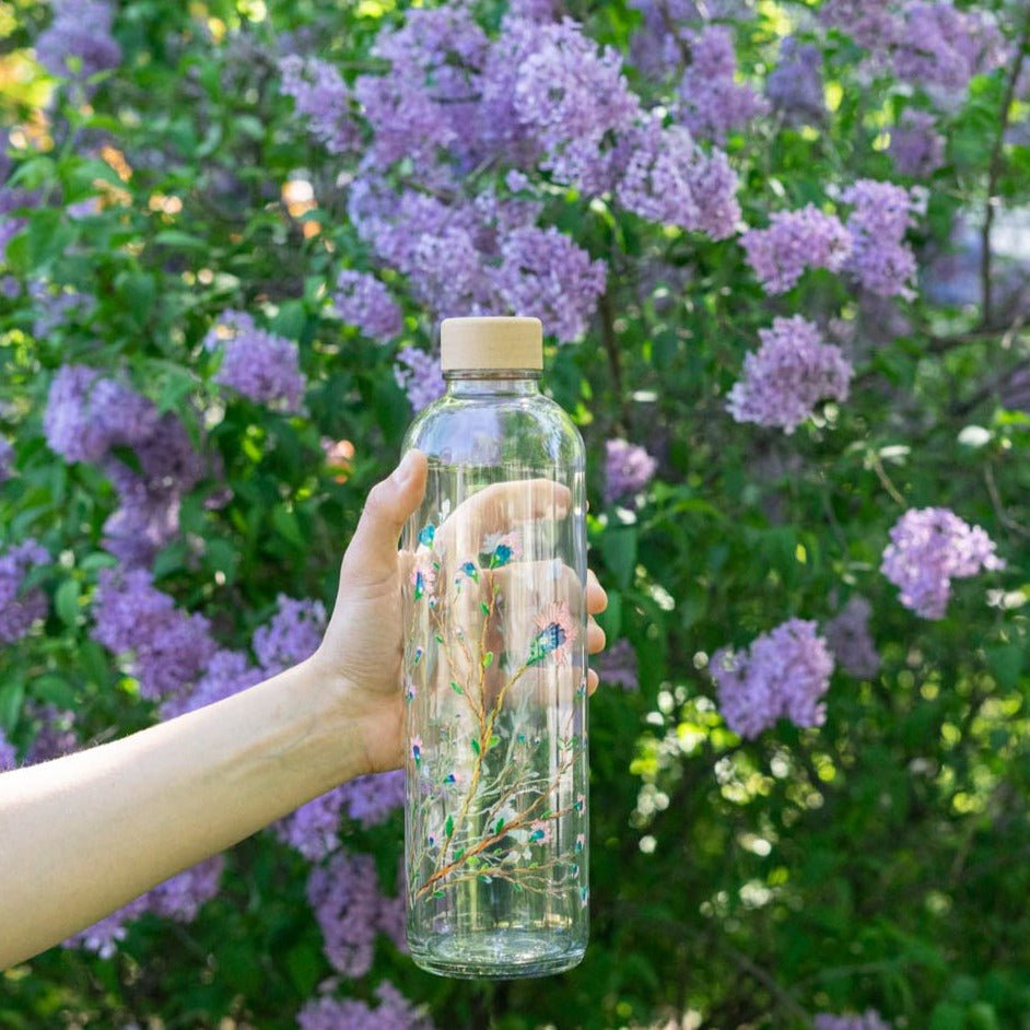 Das Motiv HANAMI auf der Glasflasche stammt von der Künstlerin Verena Rempel. Aus dem Japanischen übersetzt bedeutet HANAMI "Blüten betrachten". Schau dir die Kirschblüten einmal genauer an, vielleicht entdeckst du ein künstlerisches Detail. Die 1L Trinkflasche eignet sich perfekt fürs Büro oder Zuhause.