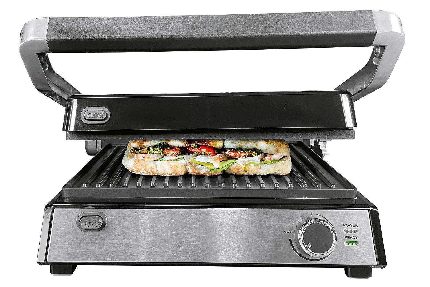 Kontaktgrill, 2000W, Temperaturregulierung, entfernbarer Tropfbehälter, Aufheizkontrolleuchte, Grillfläche 290x260cm, geschlossen und aufklappbar, höhenverstellbar