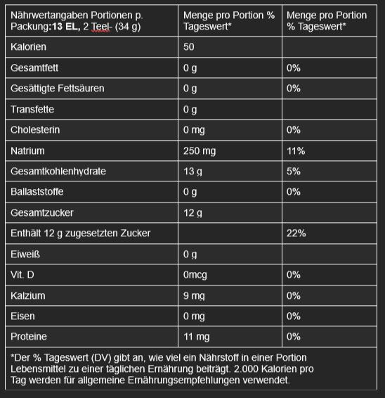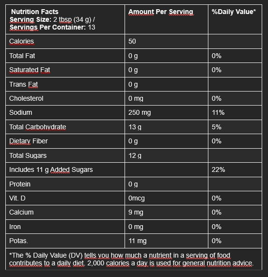Zutaten: Tomatenpüree (Wasser, Tomatenmark), brauner Zucker, Zucker, Essig, gelber Senf (Wasser, destillierter Essig, Senfkörner, Salz, Kurkuma), Honig, Salz, Maisstärke, natürliches Raucharoma, Melasse, Worcestershiresauce (Essig, Melasse, Maissirup, Wasser, Salz, Karamellfarbe, Knoblauchpulver, Zucker, Gewürze, Tamarinde, natürliches Aroma), Zwiebelpulver, Knoblauchpulver, natürliches Aroma, Karamellfarbe, gemahlener roter Pfeffer, Xanthangummi, Gewürze.