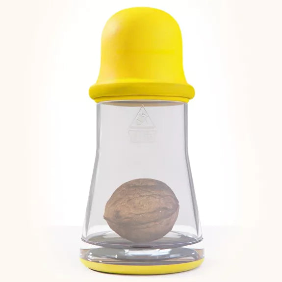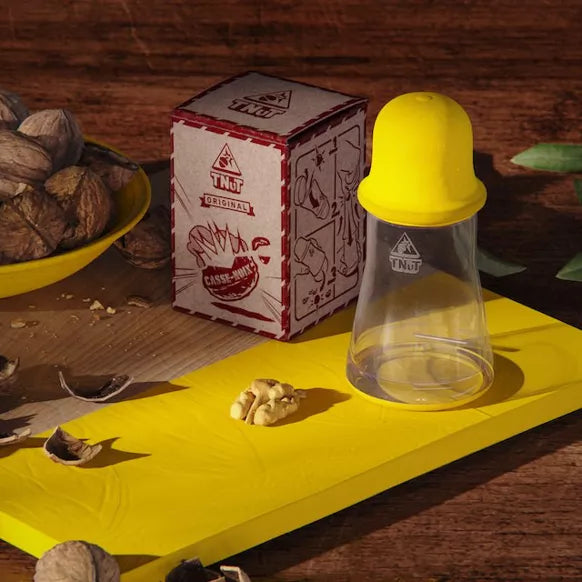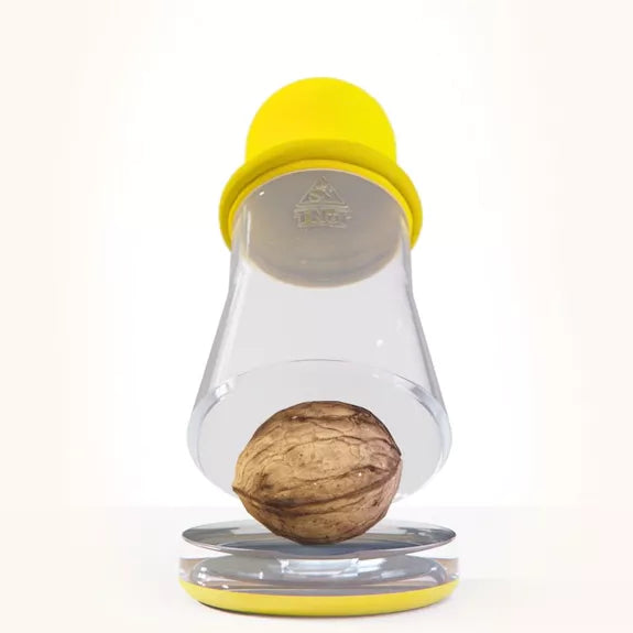 TNuT ist ein Nussknacker, der das Prinzip der Beschleunigung verwendet, um Nüsse zu knacken: Mithilfe der elastischen Hülle aus Naturkautschuk wird die Nuss auf den Boden des TNuT geschleudert, wo die Schale mit aller Sicherheit geknackt wird, ohne die Nuss zu beschädigen. Dann muss man sie nur noch genießen…