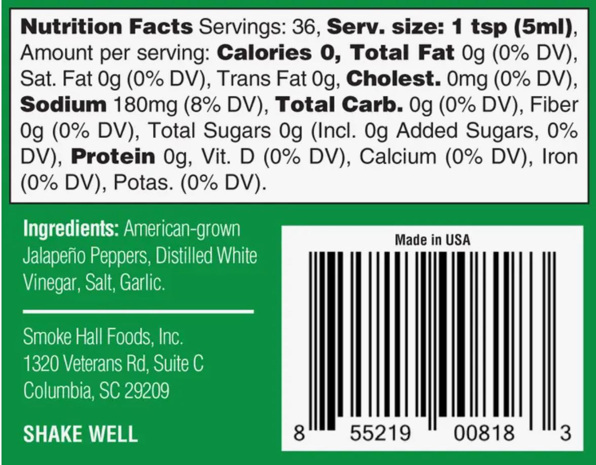 Zutaten: In den USA angebaute Jalapeño-Paprikaschoten, destillierter Weißer Essig, Salz, Knoblauch.