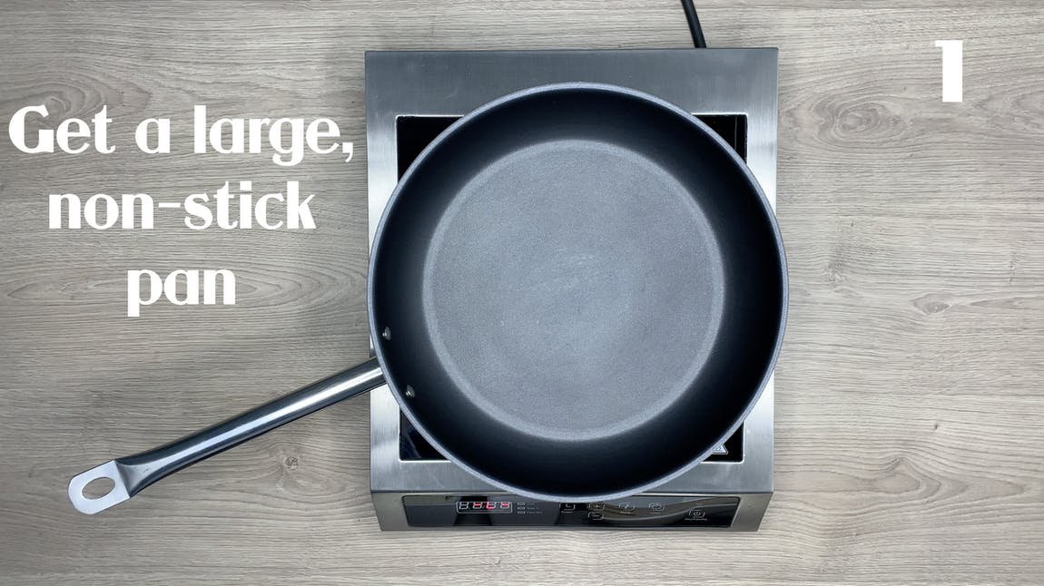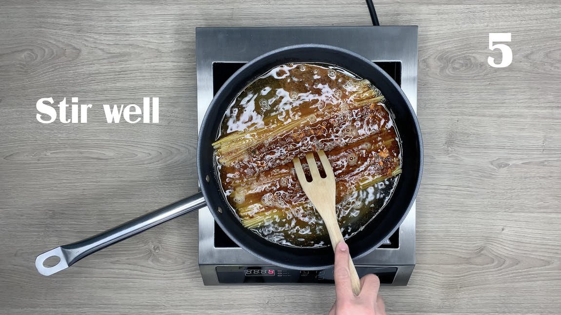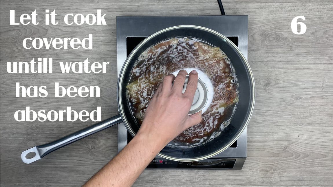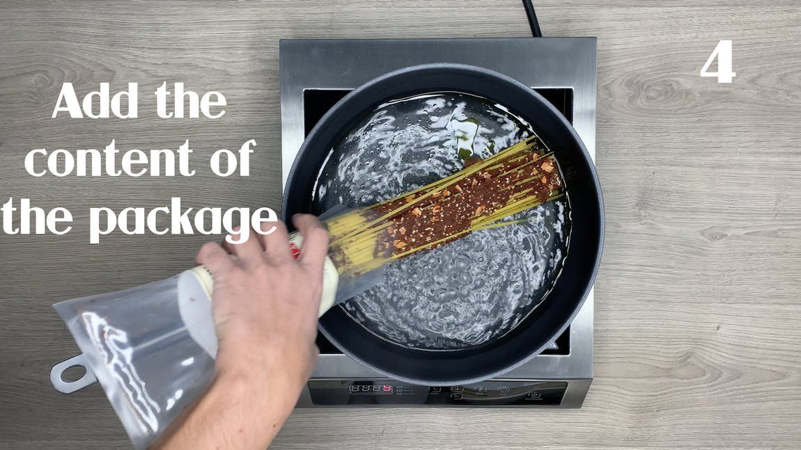 Zubereitung:700 ml Wasser und 2 oder mehr EL Öl in einer großen beschichteten Pfanne oder Pfanne zum Kochen bringen.