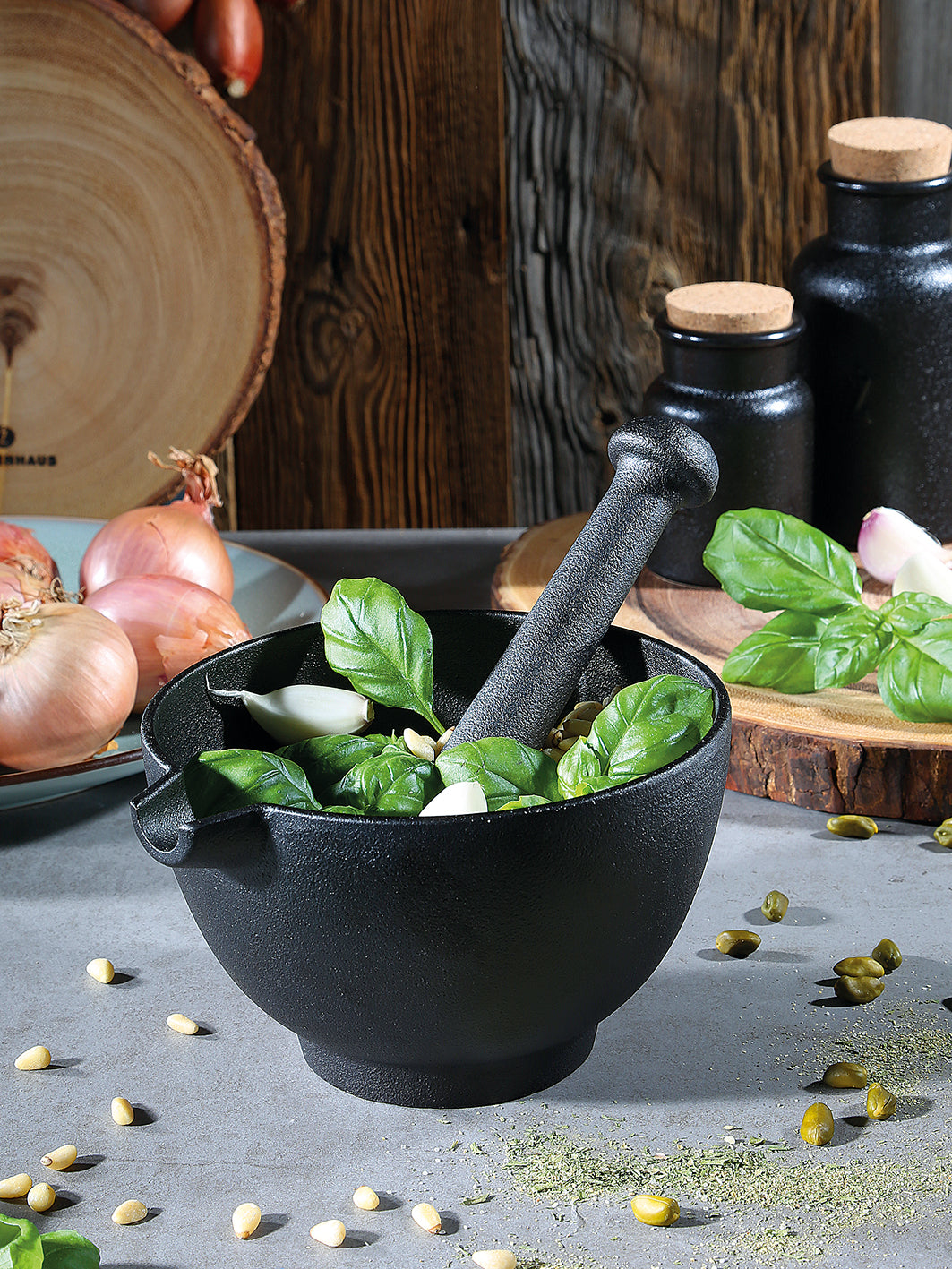 Eindrucksvoll. Der XL Mörser von Zassenhaus macht etwas her – in jeder Hinsicht. Die schwarze Schale ist ein Hingucker in Ihrer Küche. Auch das Material ist bemerkenswert. Das robuste Gusseisen mit der rauen Oberfläche hat keinen Abrieb und verleiht dem Mörser sein solides Gewicht von 2,2 kg. Das spricht für Stabilität. Klar, dass dieses Gerät mit einem Durchmesser von 15,5 cm nicht für halbe Portionen gemacht ist. Der Mörser ist ideal, wenn Sie größere Mengen Gewürze, frische oder getrocknete Kräuter zerreiben oder Pasten herstellen möchten. Die Arbeitsfläche für den Stößel ist groß genug, es springen keine Körner über den Rand. Der Ausgießer ist praktisch, wenn Sie ein Pesto oder Gewürzöl zubereitet haben und es umfüllen möchten. Veredeln Sie doch mal Olivenöl mit zerriebenem Meersalz, angedrückten Wacholderbeeren, Rosmarin, Thymian und Knoblauch. Ein geschmackvolles Geschenk!