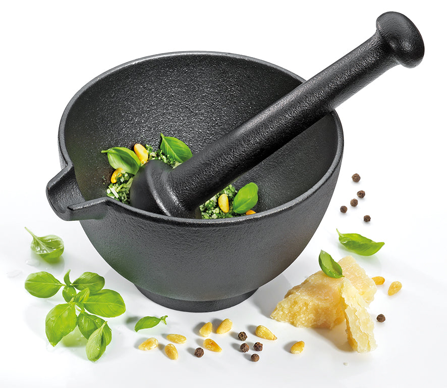 - Gusseisen, zum Zerreiben und Zerstoßen von Gewürzen sowie trockenen und frischen Kräutern