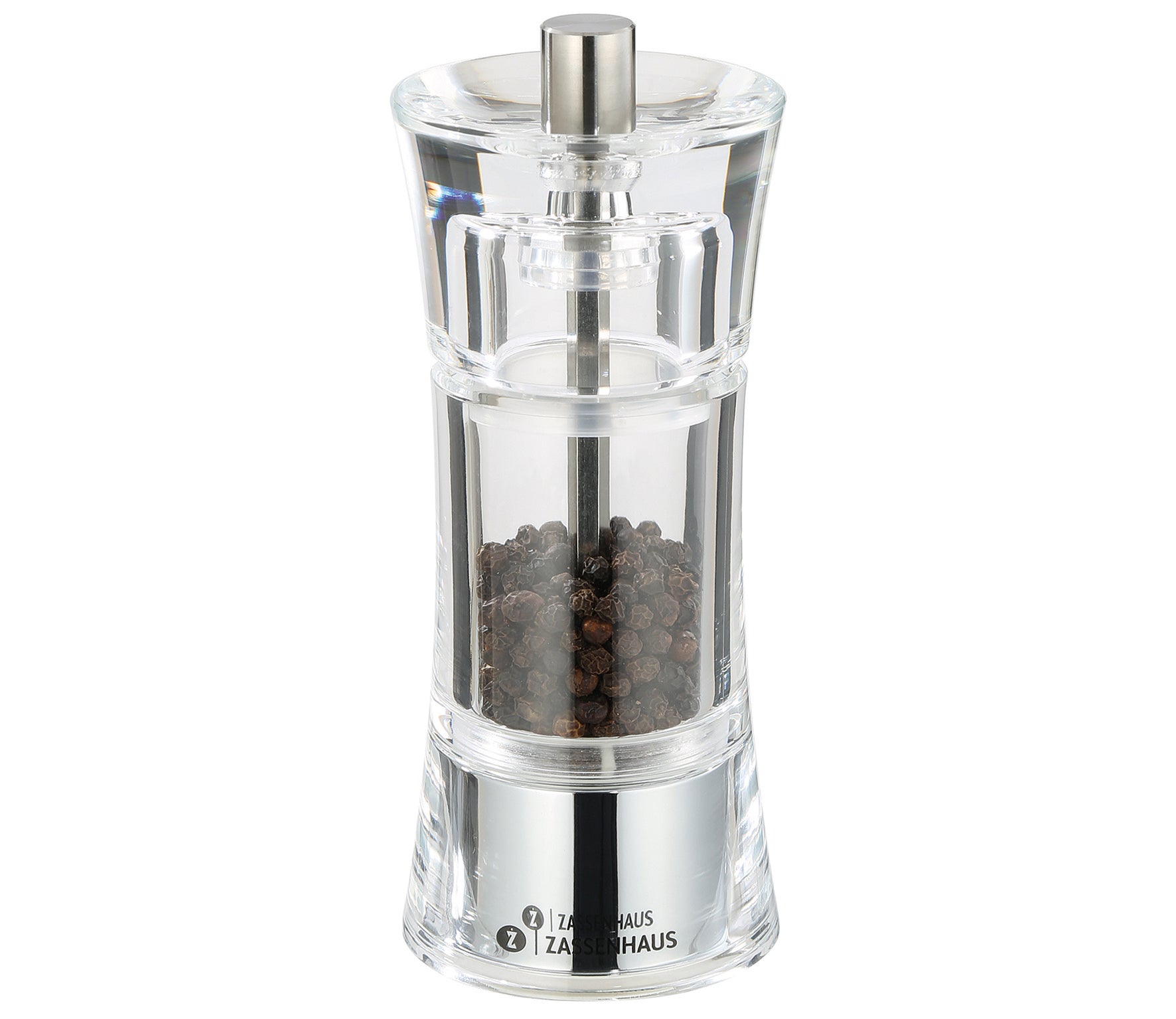 Seit 1867 stellt Zassenhaus als Traditionsmarke hochwertige Kaffee- und Gewürzmühlen her. Die Qualität ist gleichbleibend hoch, das Design geht mit der Zeit. Das trifft auch auf die Serie AACHEN zu. Die Mühlen sind aus hochwertigem Acryl und mattem Edelstahl gefertigt. Somit geben die Mühlen nicht nur in der Küche eine gute Figur ab, sonder sind auch ein Hingucker auf dem gedeckten Tisch. In allen Modellen steckt das patentierte Mahlwerk aus Hochleistungs-Keramik. Es ist härter als Stahl, Feuchtigkeit und ätherische Öle können ihm nichts anhaben. Darauf gibt Zassenhaus 25 Jahre Garantie. Das Mahlwerk arbeitet in zwei Stufen und zerlegt Pfeffer, Salz, getrocknete Kräuter und Gewürze sorgsam und gründlich. Die sechs Mahlstufen von pulverfein (1) bis grob (6) stellen Sie am Mühlenboden ein. Sie sind auf einer Skala jederzeit ablesbar und verschieben sich beim Befüllen der Mühlen nicht. Pflegetipp: Mahlen Sie ab und zu etwas Reis durch, so ist das Mahlwerk vor Verkleben geschützt.
