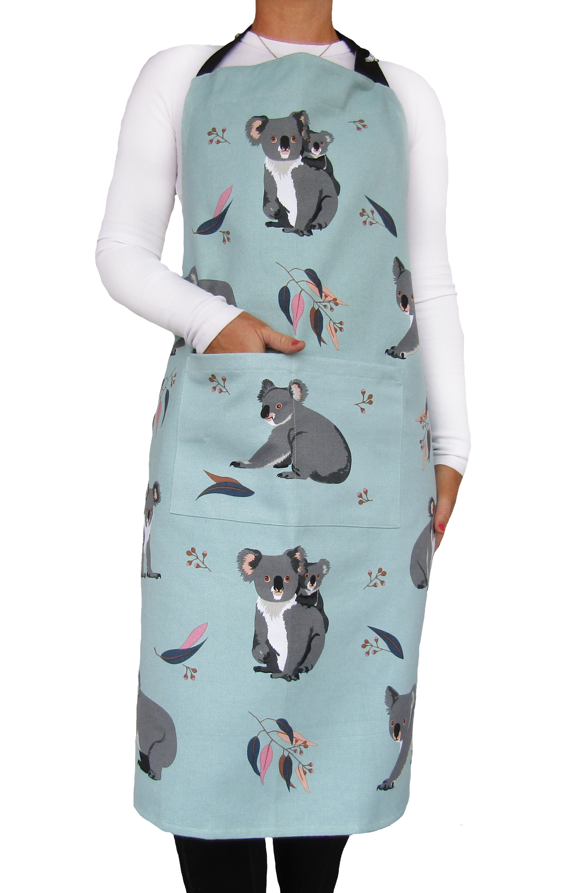 Die strapazierfähige Koalas Schürze aus 100 % schwerer Drill-Baumwolle bietet zuverlässigen Schutz bei allen Küchenarbeiten und überzeugt mit einem liebevollen Koala-Motiv.