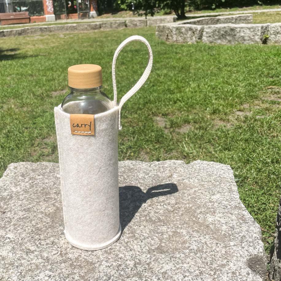 CARRY Your Bottle – Trage deine Trinkflasche in deiner neuen Upcycling-Flaschenhülle. Der Filz Sleeve aus recycelten PET-Flaschen ist der perfekte Schutz für deine Trinkflasche aus Glas. Damit du deine Trinkflasche leichter tragen und überall hin mitnehmen kannst, ergänzt eine Trageschlaufe aus Naturbaumwolle das minimalistische Design.