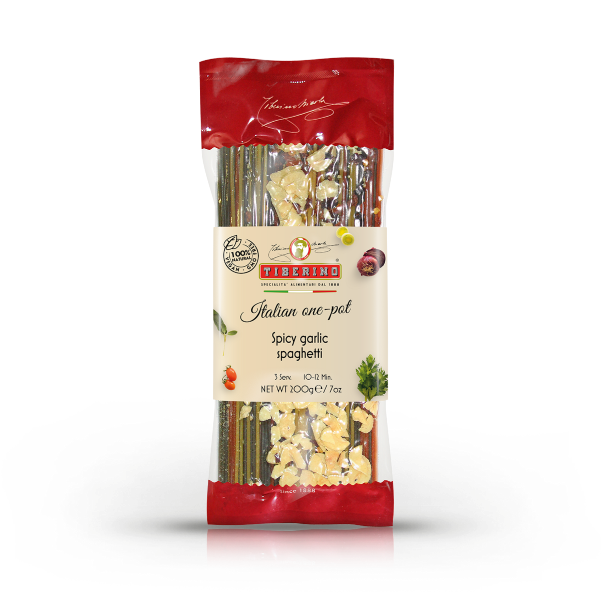 Scharfe Spaghetti mit Knoblauch, kochenfertige italienische Pasta One Pot