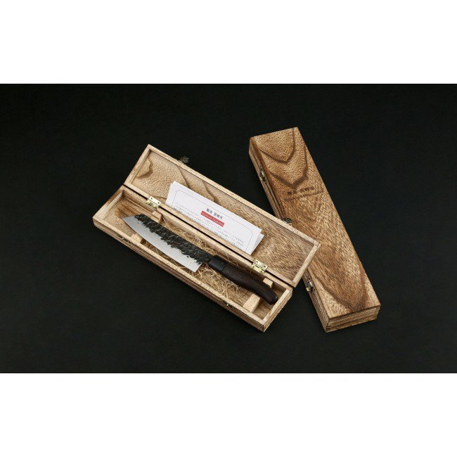 TAKAHIRO MIYAZAKI Ken ist die japanische Bezeichnung für Schwert. Die Schwertschmiede waren berühmt für Produkte mit hervorvorragenden Eigenschaften. Das Wissen um die Schmiedekunst der Schwertschmiede findet Eingang in unsere Ken-Serie. Seit Jahrhunderten erprobte Klingenformen machen die Messer der Miyazaki Ken-Serie zu den perfekten Arbeitsgeräten in jeder Küche. Die sichtbaren Spuren des Schmiedehammers auf der Klingenoberfläche schaffen einen reizvollen Kontrast zum auf Hochglanz polierten Schneidbereich. Der starke optische Kontrast - ein Stilmittel das gerne in der fernöstlichen Kunst Anwendung findet – hat auch durchaus einen praktischen Vorteil: Die durch den Schmiedehammer erzeugten Vertiefungen im oberen Bereich verringern die Oberfläche und damit die Reibung und lassen so die Klinge spielend leicht durch das Schneidgut gleiten. Der Stahl mit seinem Kohlenstoffanteil eignet sich hervorragend für Kochmesser, da er sich sehr fein ausschleifen lässt und dadurch eine sehr scharfe Schneide zulässt, ohne dass die Schnitthaltigkeit darunter leidet. Da wenig Chrom zulegiert wurde, ist der Stahl nicht rostfrei, sondern rostträge. Säubern nach dem Gebrauch und Einölen gleicht diesen scheinbaren Nachteil bestens aus. Die traditionelle Formgebung des Griffes aus Wenge mit der Zwinge aus geschwärztem Gusseisen macht das Messer zu einem Schmuckstück und Blickfang in jeder Küche. Unser Prinzip, dass die Form der Funktion untergeordnet sein muss, kommt besonders durch die benutzerfreundlichen Griffformen zum Ausdruck. Die Messer kommen in einer hölzernen Geschenkschatulle. Nach dem Gebrauch ist es ratsam, die Messer zu säubern, um ein Anlaufen des Stahles zu minimieren.