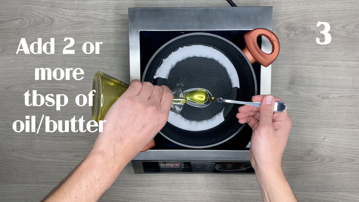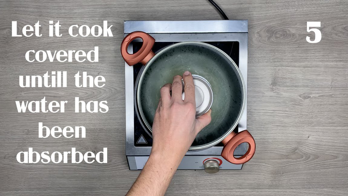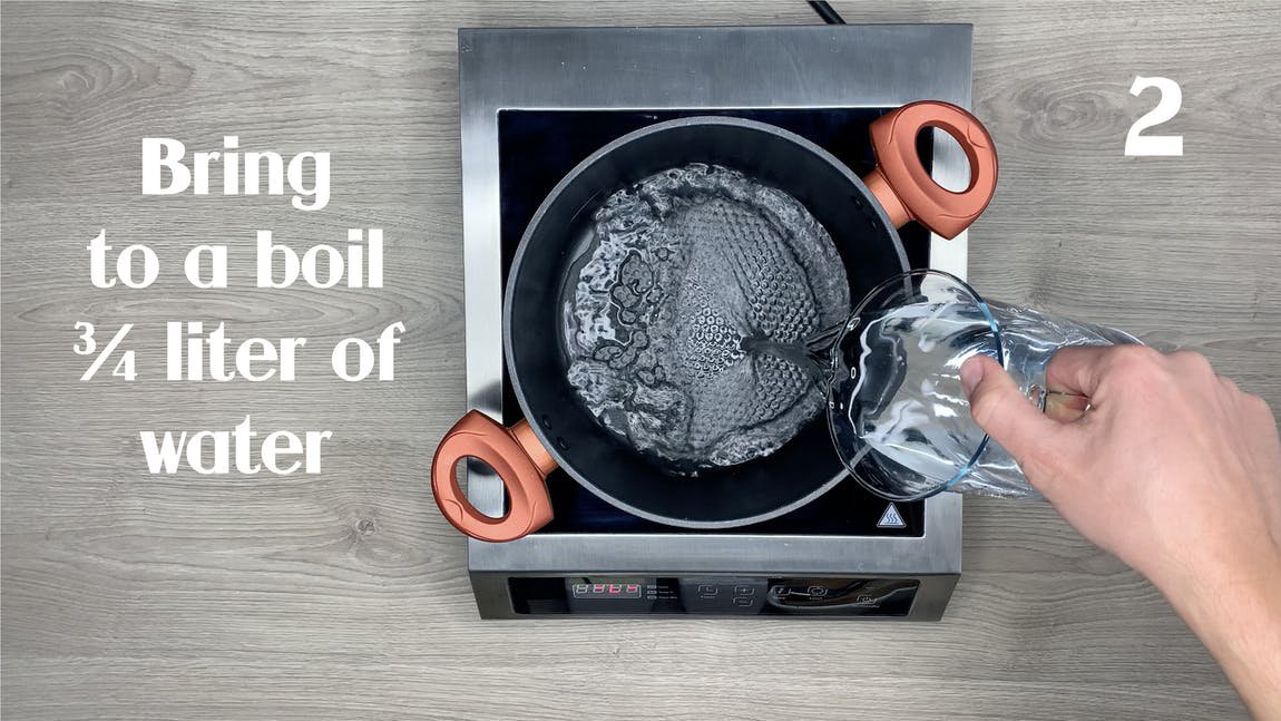 ZUBEREITUNG: Bringen Sie 700 ml Wasser und 2 oder mehr Esslöffel Öl in einer großen beschichteten Pfanne oder Pfanne zum Kochen.