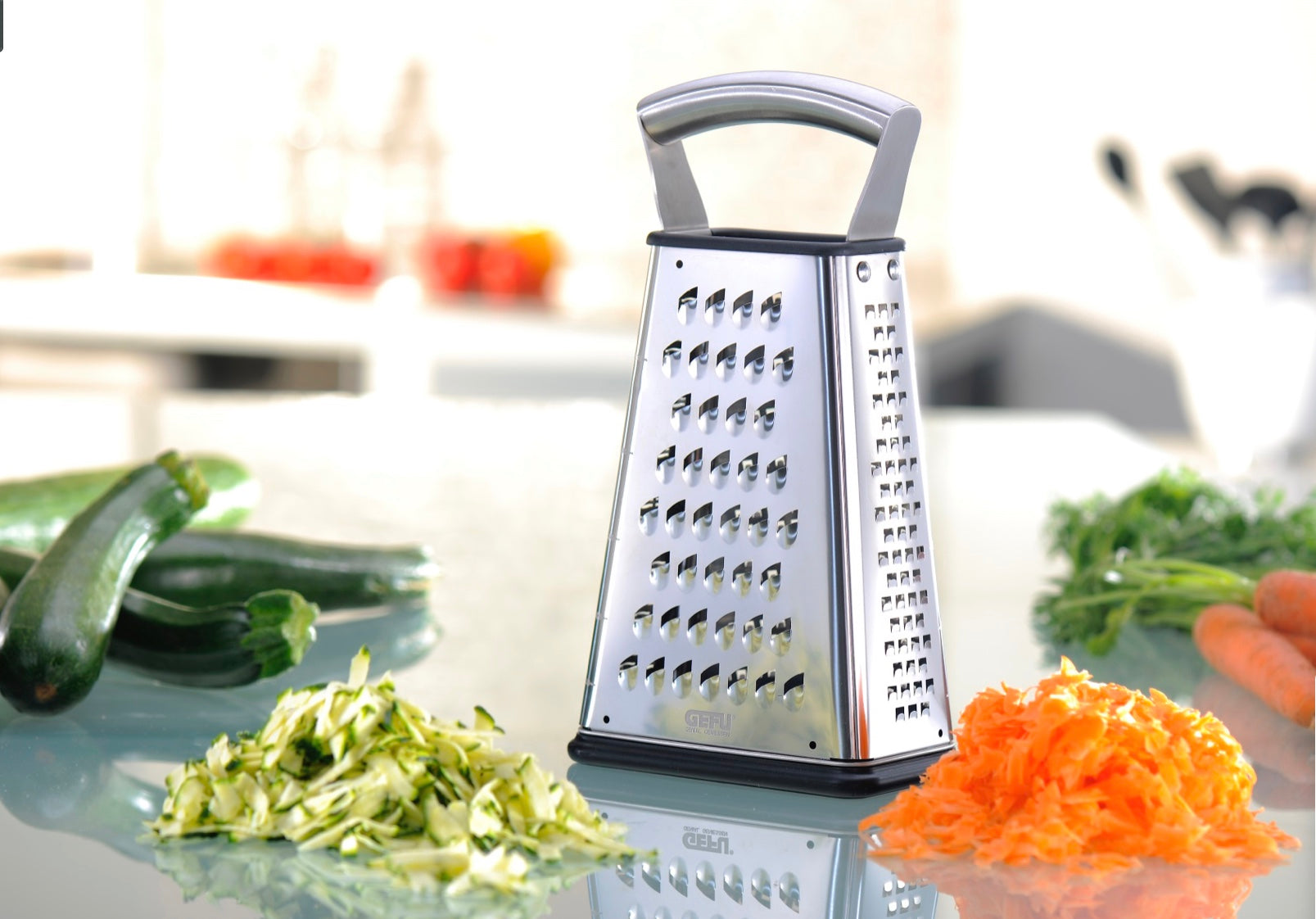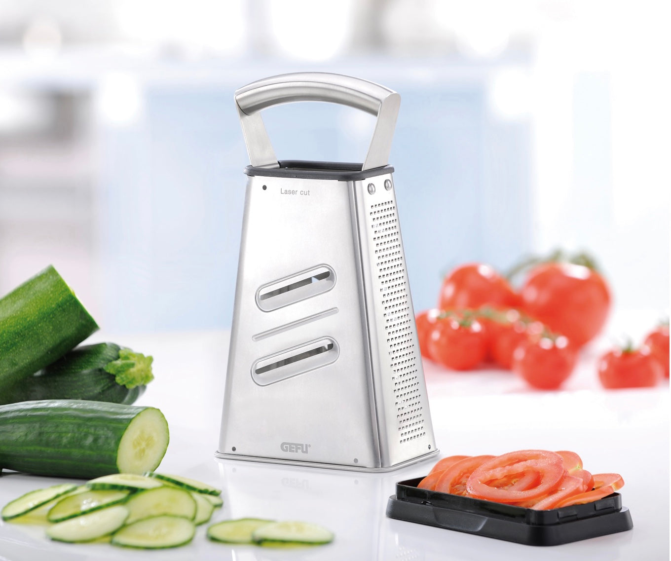 Dank der LASER CUT -Technologie sind die Reibezähne sehr scharf und garantieren lange Zeit perfekte Reibeergebnisse. Mit vier verschiedenen Reibemustern ist man jedem Gemüse, Käse sowie Schokolade, Ingwer oder Muskat gewachsen.