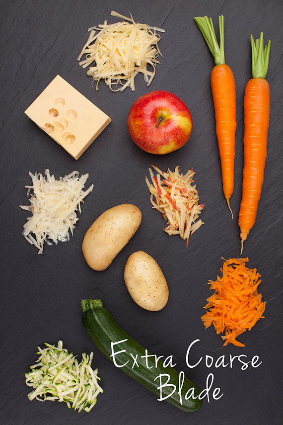 Folgende Klingenausführungen sind in dieser Serie erhältlich: Grob, 2-Wege-Schneide, Fein, Große Raspel, Sehr Grob, Sternenklinge und XL-Grob. Die Auswahl der Klinge können Sie ganz nach Ihren Bedürfnissen und dem gewünschten Reibergebnis richten.